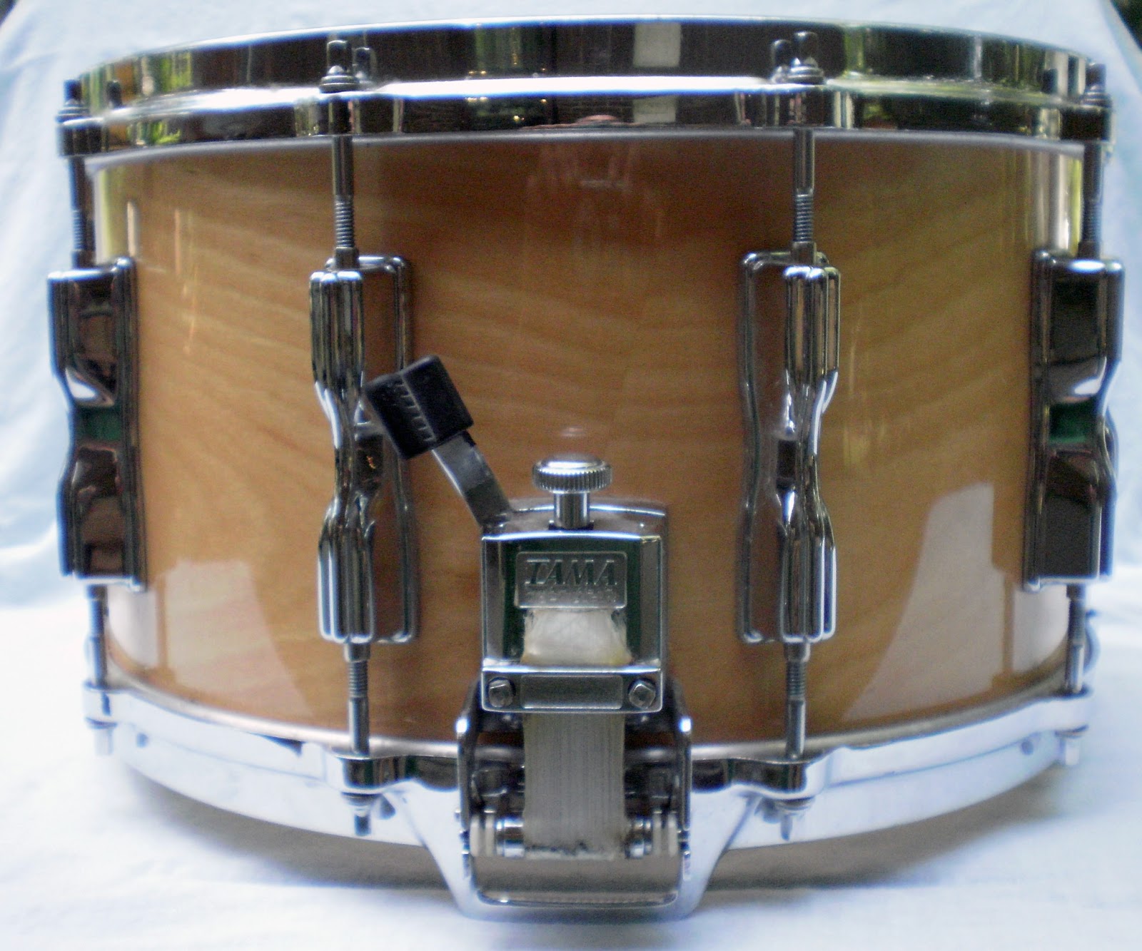 I purchased this shell and lugs from Champagne Drums in Winnipeg (they sell excellent aluminum and brass lugs and other drum components, and it's nice to be able to buy Canadian). 7x14". 9 outer plies birch, 3 inner plies walnut, and re-rings. I finished it with a green stain and shellac as a topcoat. Purchased some of the newly developed "S hoops", which are intended to provide the benefits of diecast hoops without the weight - or cost, for it.